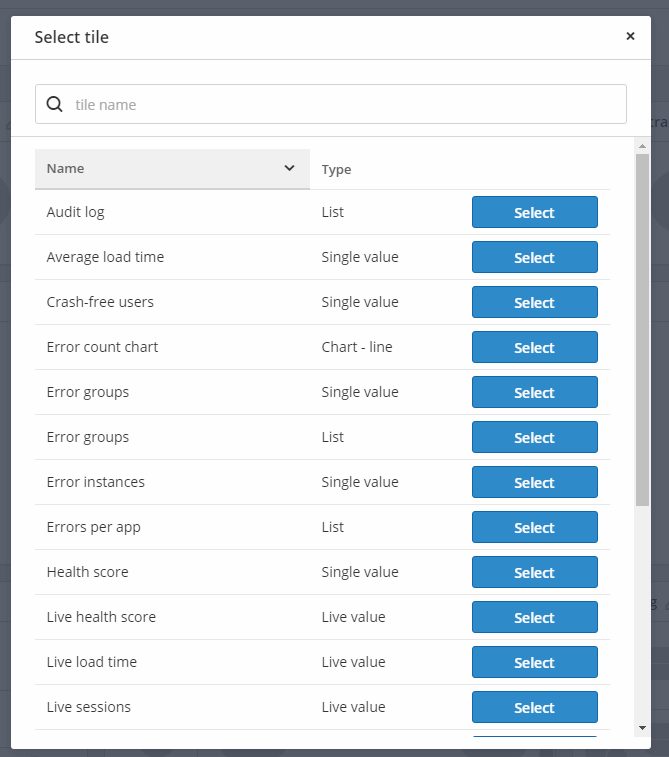 2. Select the type of tile you would like to add in the ‘Select tile’ window: