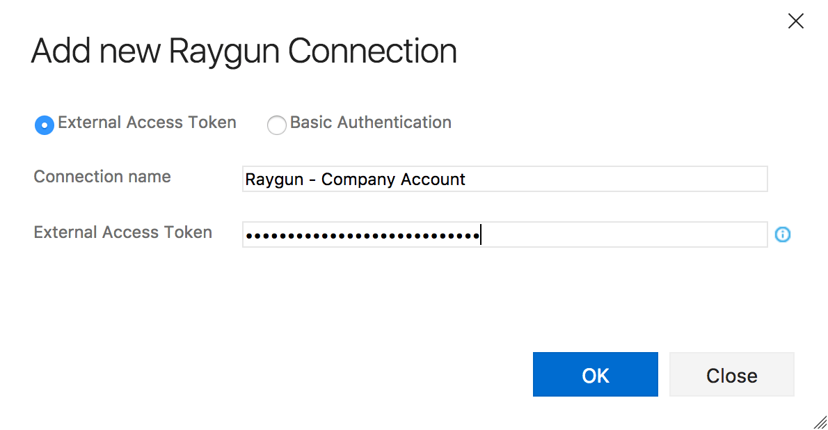- External Access Token – Obtain an External Access Token. You can create this token within your user settings in Raygun, just navigate to https://app.raygun.io/user and check the External Access Token section. Generate a new token if one does not already exist. Remember to use a secret variable for the token if going this route.