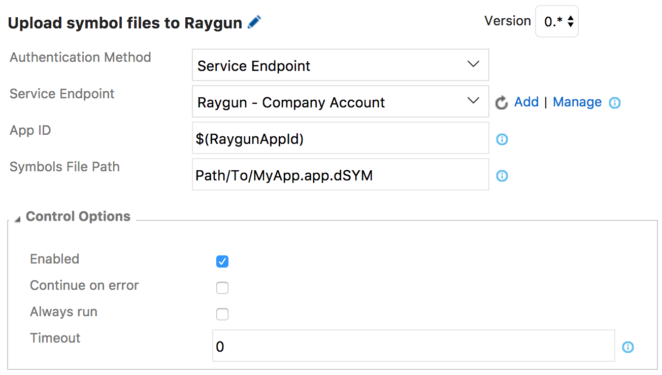 - Select this endpoint via the name you chose in #4 whenever you add the Upload Symbols to Raygun task to a build definition