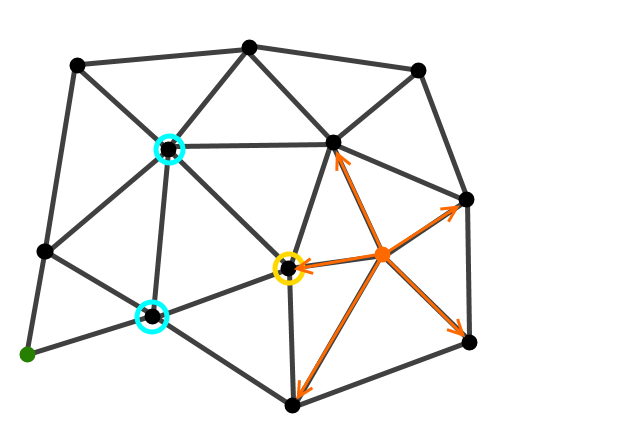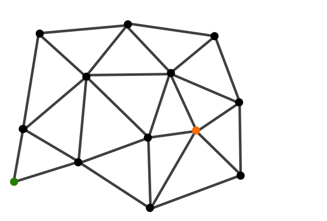 Here is a graph we want to traverse. Starting at the orange dot we want to find the shortest route to the green dot.