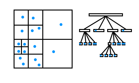 Here you can see data points (in blue) within a quadtree. On the left is a spacial representation on the right is the tree structure.