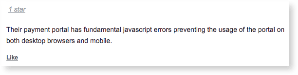 Software errors can prevent the usage of vital parts of your app – like your payment portal. Unsurprisingly, these are the errors causing the most damage to your bottom line. Take Athenacare, for example, who suffered critical JavaScript errors on their payment portal causing frustrated customers to take to Facebook.