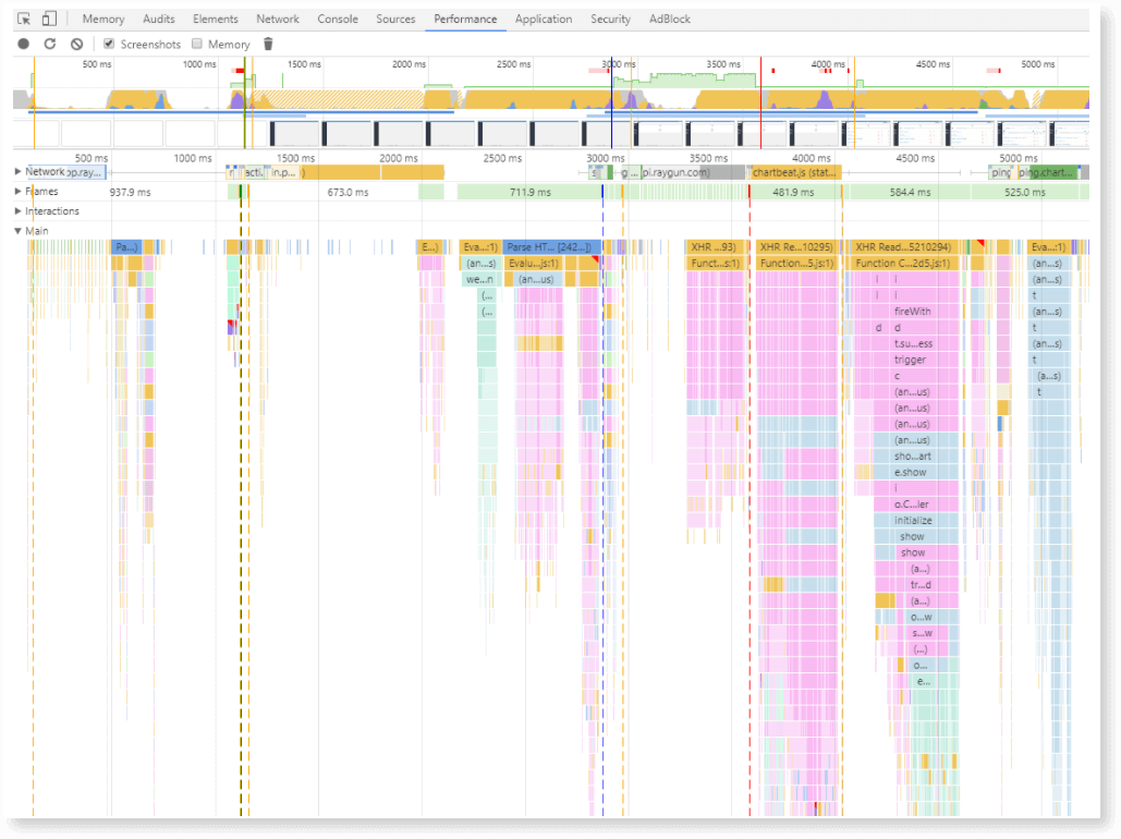 Chrome Dev Tools showed a definite bottleneck with a script for one of our charts. Two method calls inside the chart script were causing a bottleneck, one was a ‘filter’ method, and the other was a ‘bucket’ method.
