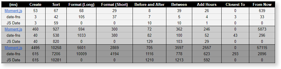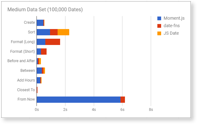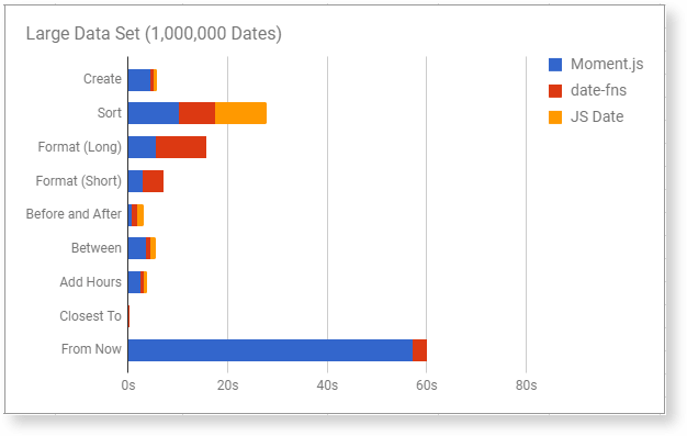 Firstly, results show a significant overhead associated with the creation of Moment objects. As you can see from the above tests, the creation speed of a Moment can range from 7x to 17x the creation speed of a native JS Date object. Date-fns does not suffer from such overheads as it utilizes JS Dates instead proving a wrapper like Moment.js.